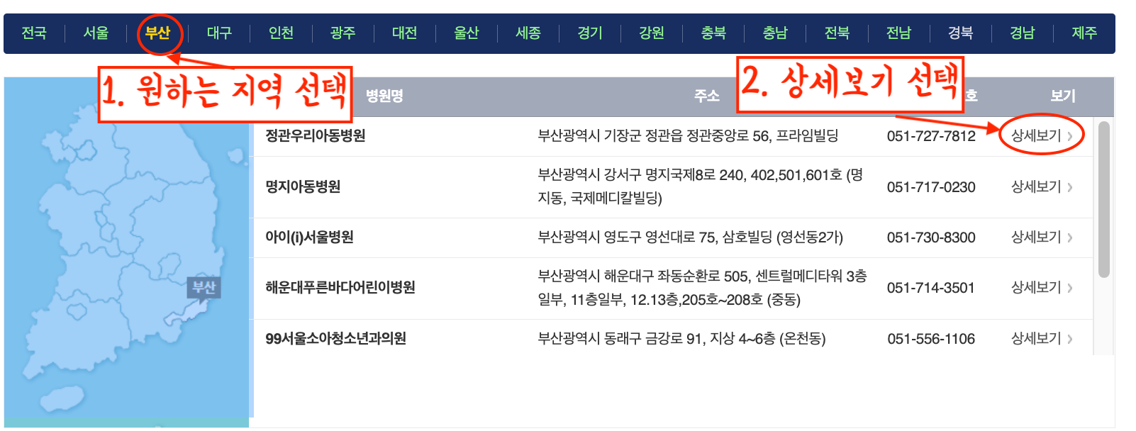 부산 지역에 야간진료 혹은 휴일진료가 가능한 소아과는 총 7곳이 있고 전화번호와 운영시간을 요일별로 공유해 드리니 아이가 아프기 전에 정보는 미리미리 챙겨보시길 바랄게요.